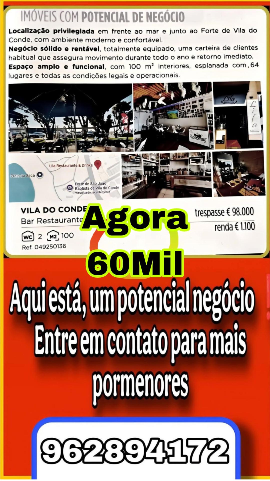 PARTILHAR http://www.facebook.com/sharer.php?u=https://zone.dinosmega.com/posts/192🌟 GRANDE OPORTUNIDADE DE NEGÓCIO EM VILA DO CONDE! 🌟 📍 Localização Premium – em frente ao mar e junto ao Forte de Vila do Conde, com vista incrível e ambiente moderno. 💼 Negócio sólido e rentável, totalmente equipado e com carteira de clientes fidelizada — retorno imediato garantido! 🏠 Espaço amplo e funcional, com 100 m² interiores + esplanada com 64 lugares, cumprindo todas as normas legais e operacionais. 💰 Trespasse: €98.000 🏠 Renda: €1.100 🍽️ Ideal para quem procura investir num bar/restaurante de sucesso, pronto a funcionar e com grande potencial de crescimento! 📞 Entre já em contato e não perca esta oportunidade! 👉 962 894 172 ✅PARTILHAR👉▪️ http://www.facebook.com/sharer.php?u=https://zone.dinosmega.com/posts/1920 Commentaires 0 Parts 923 Vue 0 Aperçu -